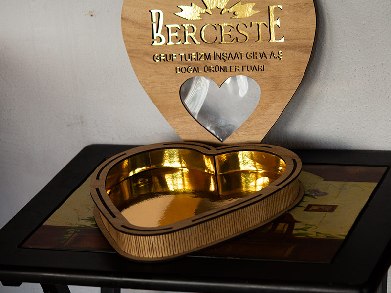 3 mm MDF’den üretilmiş, kalp tasarımında, gıda ile teması önleyici iç koruma kağıdı bulunan çikolata ve lokum sunum kutusu. Kurumsal logolu üretim imkanı ile toptan satışa uygundur.